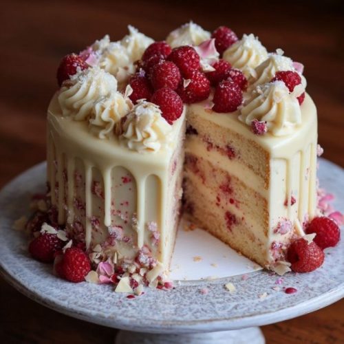This White Chocolate Raspberry Dream Cake features tender vanilla cake layers infused with melted white chocolate, a tangy raspberry filling, and a silky white chocolate buttercream frosting. It’s elegant enough for celebrations but simple enough for any weeknight treat.