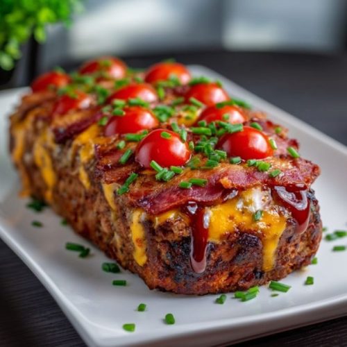 This juicy turkey bacon cheeseburger meatloaf combines all the flavors of a classic cheeseburger—smoky bacon, cheddar, pickles, and tangy condiments—baked into one comforting family dinner.