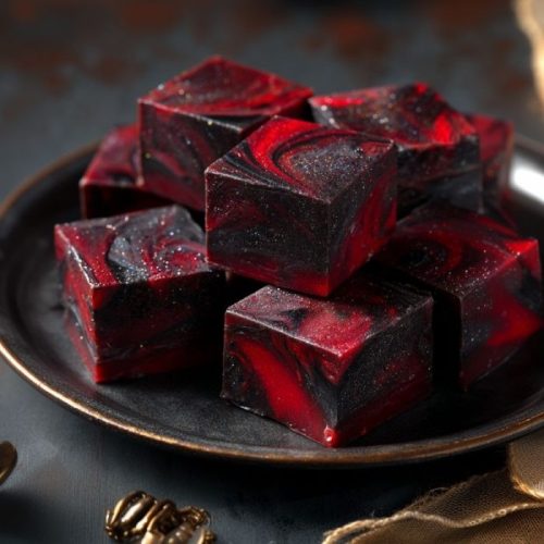 A rich, velvety dark chocolate fudge with swirls of red and gray, finished with a silvery shimmer that captures the beauty of a Halloween night sky. Perfectly sweet, slightly mysterious, and wonderfully festive for the spooky season.
