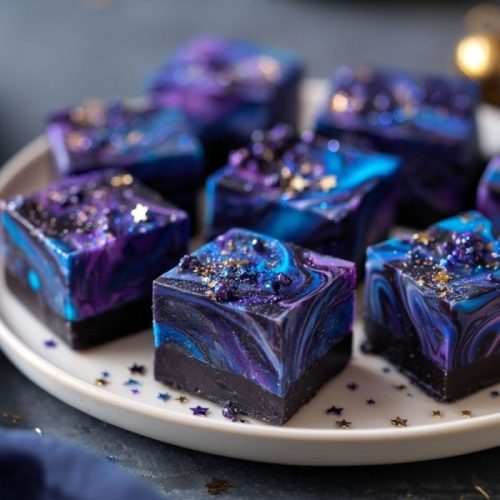 This Halloween Midnight Galaxy Fudge combines silky dark chocolate with swirls of blue, purple, and white chocolate, creating a stunning starry-night effect. Topped with edible glitter or star sprinkles, it’s as beautiful as it is delicious—a sweet showstopper for Halloween or any cosmic-themed celebration.