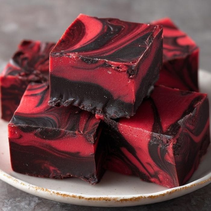 That cruise ship buffet might’ve been miles away, but each Halloween since, this fudge brings that same spark of joy back into my kitchen. I love watching my kids’ eyes light up as they swirl the chocolate, arguing over whose “vampire marble” looks best. It’s messy, silly, and a little magical—exactly how Halloween should feel. When the fudge sets and I finally slice it, the marbled red and dark chocolate looks almost too pretty to eat. Almost.