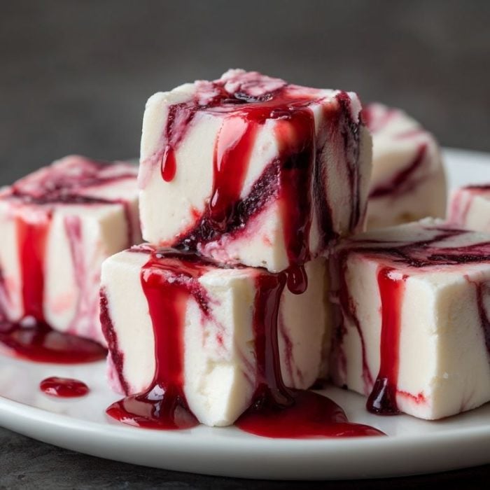 A creamy white chocolate fudge infused with strawberry gelatin and swirled with dark chocolate for a dramatic “vampire’s kiss” effect. This festive Halloween treat is sweet, smooth, and eye-catching—perfect for parties or family movie nights.