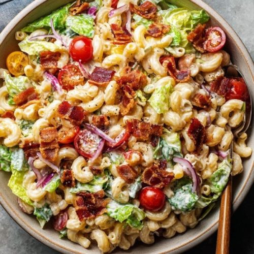 As a mom juggling work, home, and endless laundry piles, I’m always drawn to dishes that make life simpler but never compromise on taste. This salad checks every box — quick, budget-friendly, and satisfying enough that even my husband doesn’t ask, “Where’s the meat?” It’s everything you love about a classic BLT sandwich, but tossed into a creamy pasta salad that’s perfect for picnics, potlucks, or lazy weekday dinners.