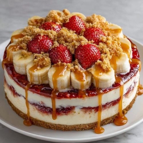 A luscious layered cheesecake that combines two timeless desserts—strawberry crunch and banana pudding—into one creamy, fruity masterpiece perfect for family gatherings or holiday tables.
