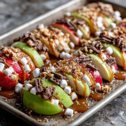 Crisp apple slices layered on a sheet pan, drizzled with caramel and melted chocolate, then topped with nuts, marshmallows, and a sprinkle of sea salt — the easiest, no-stick version of a fall classic.