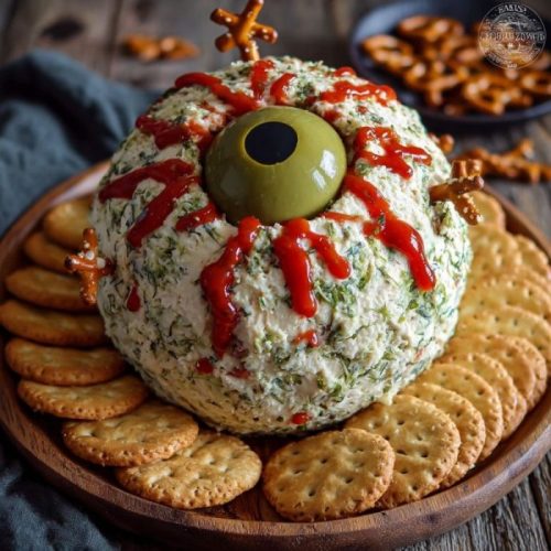 A tangy, creamy cheese ball bursting with dill pickle flavor and shaped like a spooky eyeball—perfect for Halloween parties or any fun gathering.