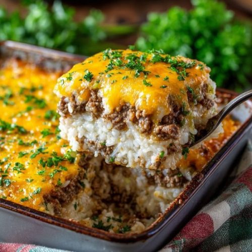 A cozy, creamy casserole made with ground beef, rice, mushroom soup, and cheddar cheese—simple ingredients that come together into a rich, comforting meal perfect for busy weeknights.
