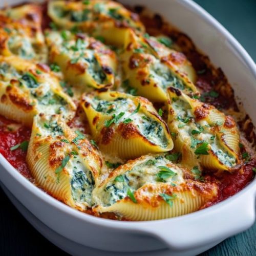 Tender pasta shells filled with creamy ricotta, mozzarella, and Parmesan, baked in marinara sauce until bubbly and golden—a simple, comforting Italian-inspired meal.