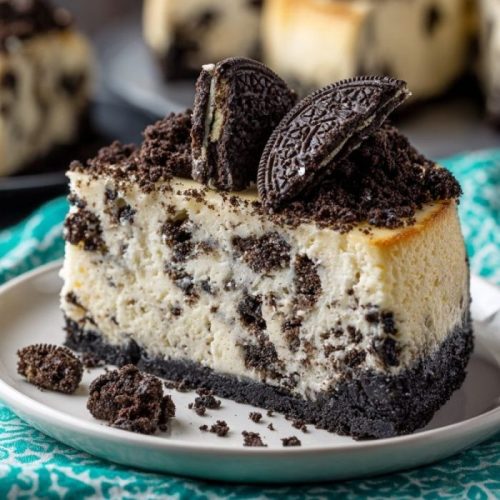 A smooth, velvety cheesecake layered with crushed Oreos in every bite, resting on a buttery cookie crust and topped with more chocolate cookie crumbles for the perfect mix of creamy and crunchy textures.