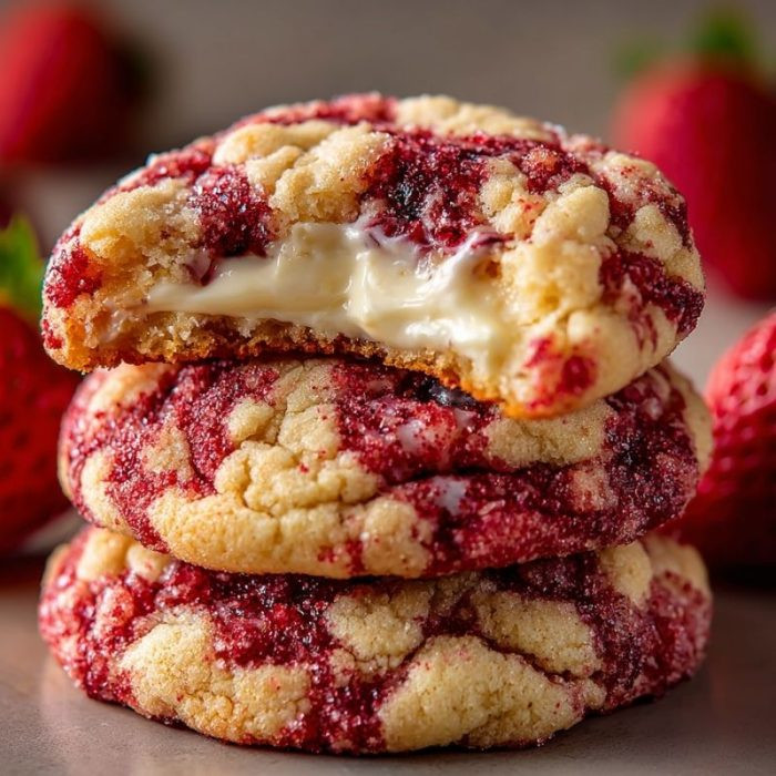 - Each cookie has chewy edges, a creamy cheesecake middle, and ribbons of fresh strawberry sweetness—perfect with milk or coffee.