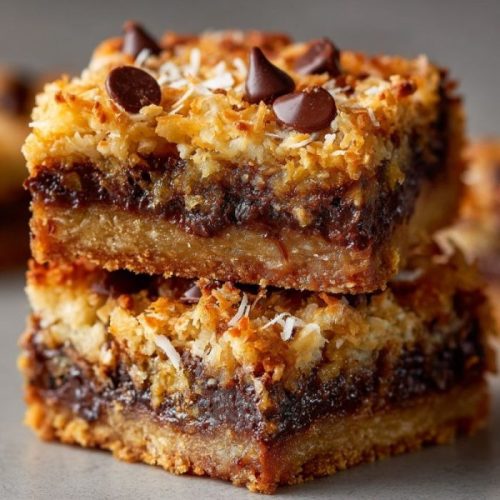 I remembered these Millionaire Magic Bars I’d once tried at a coworker’s potluck. They had everything I loved: a buttery graham crust, gooey caramel, sweet coconut, and melty chocolate. Simple ingredients that somehow come together into something rich and memorable. No mixers, no fuss—just layers of flavor baked into golden perfection.