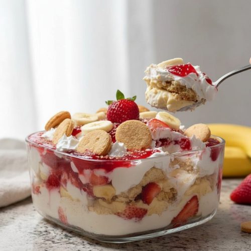What began as a quick dessert experiment turned into one of our family’s most-requested treats. There’s just something magical about the way silky pudding, fluffy cream cheese, and fresh fruit melt together after a few hours in the fridge. When I first sliced into it, those layers, golden crust, creamy filling, glistening strawberries, and sweet bananas, looked like summer in a dish.