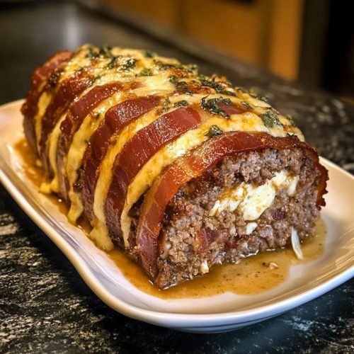Serving this meatloaf with sides like mashed potatoes, roasted vegetables, or a crisp salad creates a meal that feels both festive and approachable. The glaze caramelizes over the bacon, the cheese melts perfectly into the meat, and every slice carries layers of flavor that make dinner feel special.