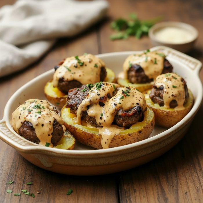 Steak Stuffed Baked Potatoes With Creamy Parmesan Sauce combine fluffy baked potatoes with tender, seasoned steak and a rich, cheesy sauce, creating a flavorful and satisfying meal.