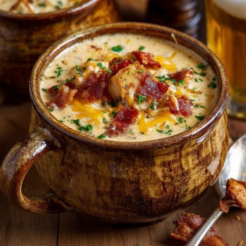 A creamy, savory Chicken Bacon Beer Cheese Soup made with tender chicken, smoky bacon, sharp cheddar, and a rich beer infused broth. Cozy, satisfying, and perfect for quick weeknight cooking.