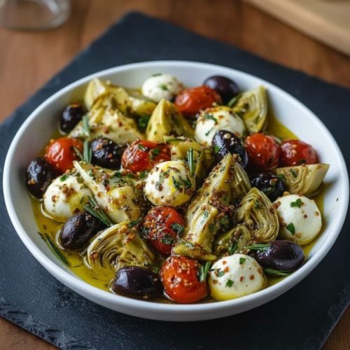 When the olive oil mixture warmed slightly in my hands as I whisked everything together, it reminded me how much joy simple ingredients can bring. As the mozzarella, artichokes, and olives soaked up the herbs, the bowl looked so inviting I kept stealing little tastes to check the flavor. By the time we sat down, everyone had gathered around the table with slices of crusty bread, scooping up the marinated bites before I even had a chance to take a photo. It was the kind of recipe that made our everyday dinner feel like it belonged on a sunny patio somewhere far away.