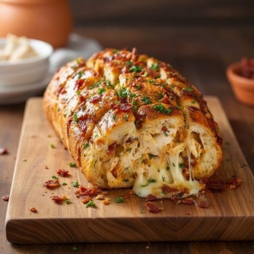 Cheesy Chicken and Bacon-Stuffed Bread Loaf is a warm, cheesy French bread filled with chicken, bacon, and a creamy seasoned mixture, baked until bubbly and perfect for quick dinners, gatherings, or family-style snacking.