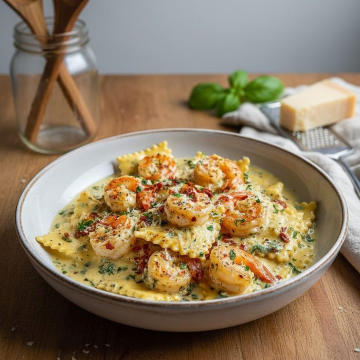 Creamy Shrimp And Parmesan Ravioli is a comforting bowl of cheese ravioli tossed with tender shrimp in a velvety Parmesan cream sauce, ready in under 30 minutes and perfect for busy families.