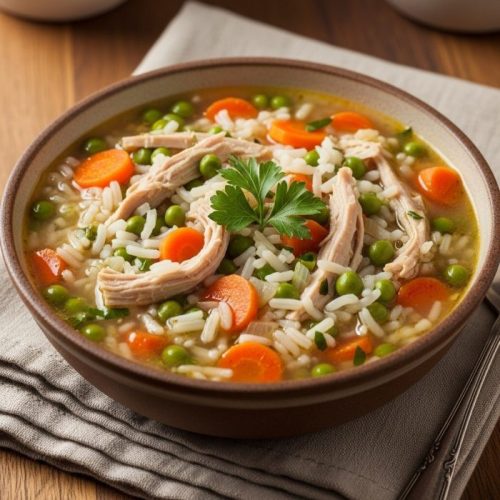 Turkey, Pea And Carrot Rice Soup fits naturally into evenings that need a steady, dependable meal. It uses simple ingredients and turns them into something that feels complete without extra effort. The pot stays warm, the bowls refill easily, and the pace of the night slows just enough.