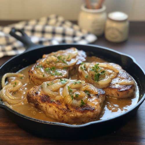 Smothered Pork Chops And Gravy Skillet fits naturally into a home that runs on schedules and shared meals. It delivers a full plate without demanding extra dishes or complicated timing. The kind of meal that brings everyone to the table without reminders.