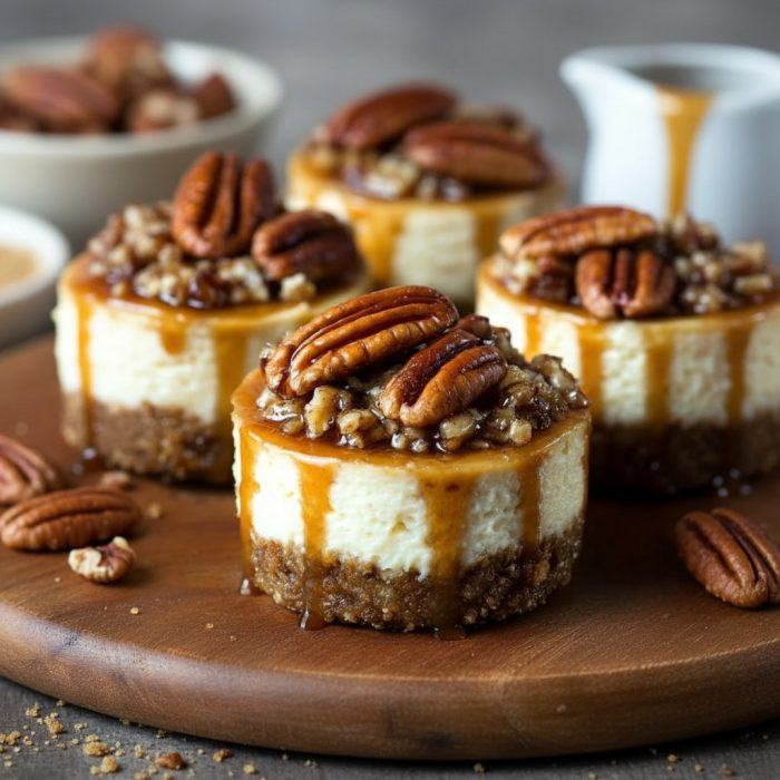 Mini Pecan Pie Cheesecakes combine a graham cracker crust, creamy cheesecake filling, and a sticky pecan pie topping baked into individual portions perfect for sharing.