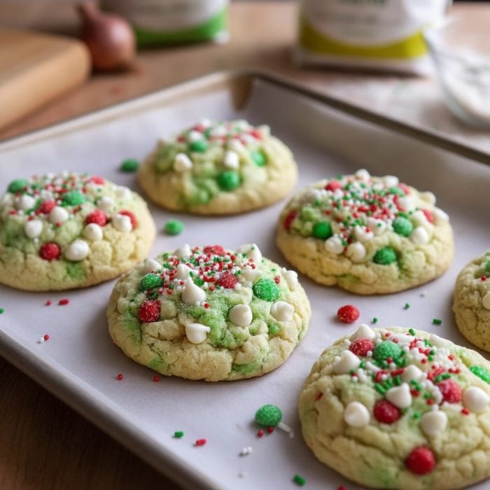 Grinch Cookies are soft, chewy sugar cookies tinted bright green, filled with white chocolate chips, and finished with festive red and green decorations.