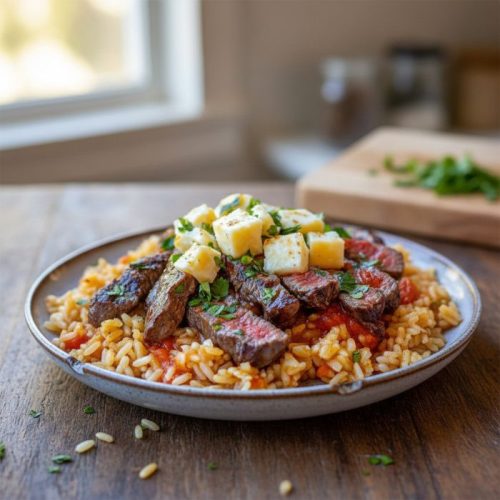 Reheat rice and steak gently in a skillet or microwave with a splash of broth.