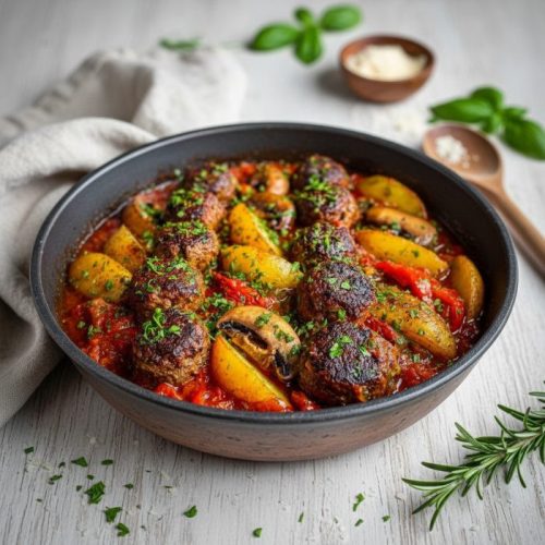 Baked Beef Meatballs Potatoes and Mushrooms in Tomato Sauce settles the evening in a quiet, steady way. Once it goes into the oven, the house fills with familiar smells and the pace of the night naturally slows, leaving room for everyone to ease into dinnertime.