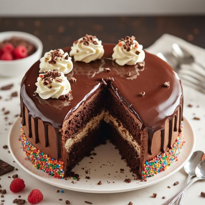 Top with whipped cream and sprinkles if desired. Let the cake rest for 15 minutes before slicing so the layers hold cleanly.