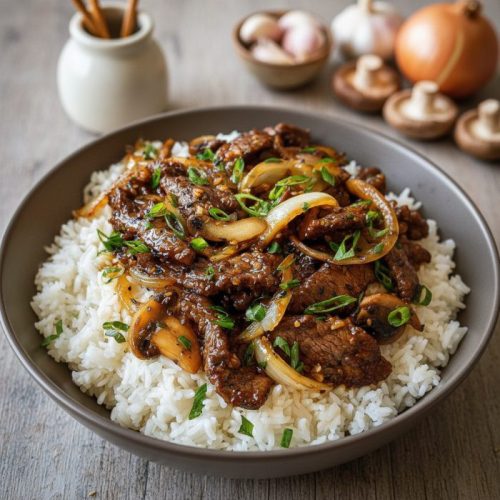 By the time I tied my hair back and pulled out the skillet, the plan was clear. Thin slices of beef, onions, mushrooms, and a glossy sauce over rice felt like the right balance for the night. It was the kind of meal that cooks quickly, fills plates generously, and keeps everyone at the table just a little longer.