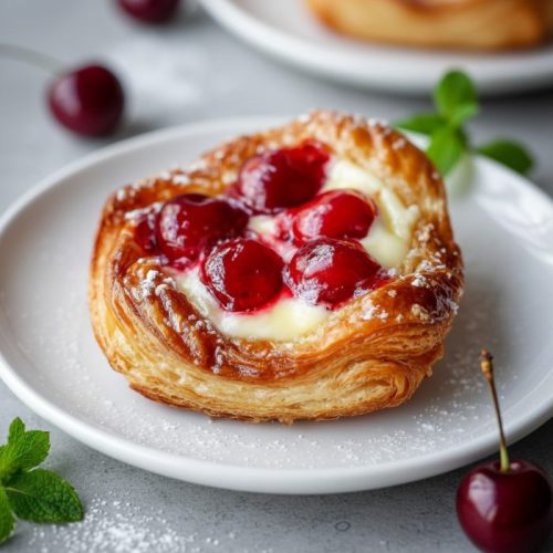 Cherry Cream Cheese Danish settles easily into slower mornings, when the oven has time to warm and everyone lingers a little longer at the table. The ingredients stay familiar and straightforward, yet the finished pastry feels intentional and inviting. It is the kind of baking that fits neatly into a busy day without taking it over.
