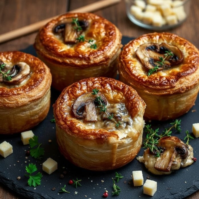 Mini Mushroom And Gruyère Pot Pies With Thyme feature a creamy mushroom filling tucked into flaky puff pastry and baked until golden, perfect for a cozy meal or elegant appetizer.