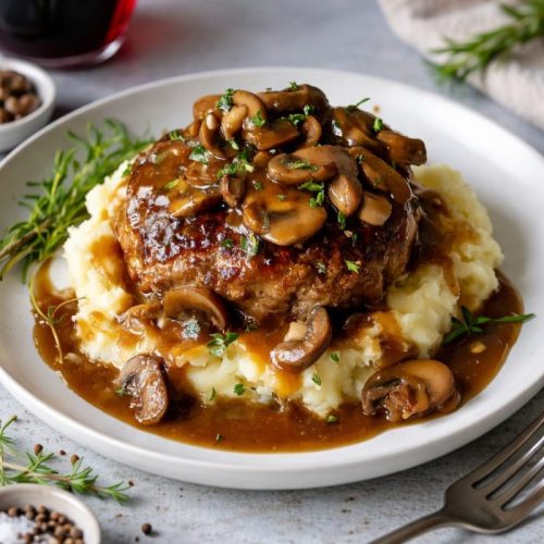 This Salisbury steak has settled into our dinner rotation because it brings a sense of ease to busy days. As it cooks, familiar aromas move through the kitchen and draw everyone closer, making the table feel like the natural place to land. From shaping the patties to watching the gravy thicken, each step moves at a calm, reassuring pace.