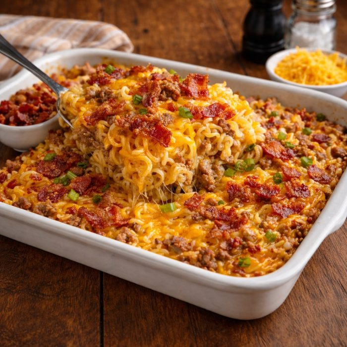 Bacon Cheeseburger Ramen Noodle Bake works well on nights when time is short and everyone is ready to eat. It comes together without a long prep list, relies on familiar ingredients, and delivers a meal that feels hearty without extra effort. On evenings when energy is already stretched thin, that kind of simplicity makes a difference.