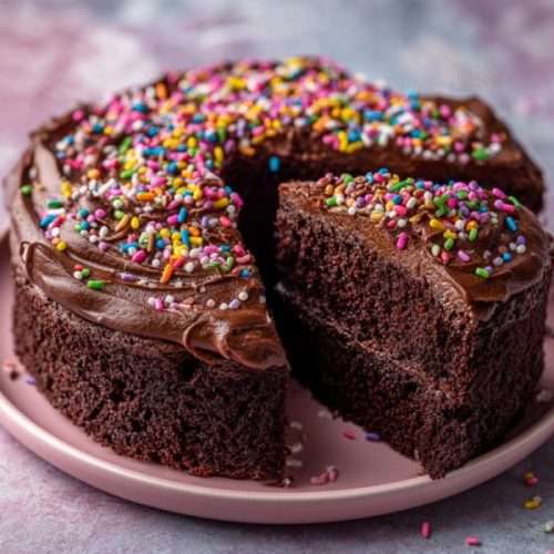 A soft, rich chocolate cake mixed and baked in one pan using simple pantry staples, then finished with chocolate frosting and optional rainbow sprinkles for a cheerful Valentine’s Day treat.