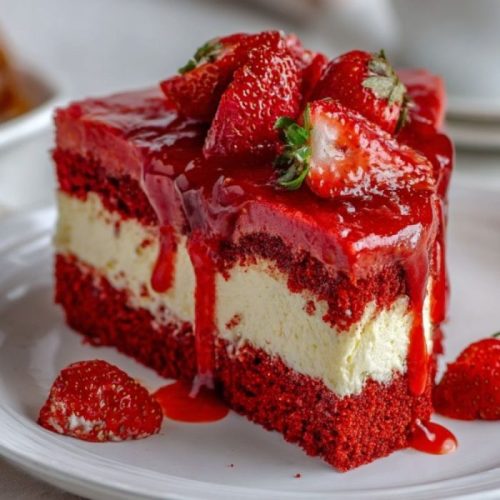 A layered Valentine’s Day dessert with tender red velvet cake, creamy cheesecake, and a glossy strawberry topping that balances richness with freshness.
