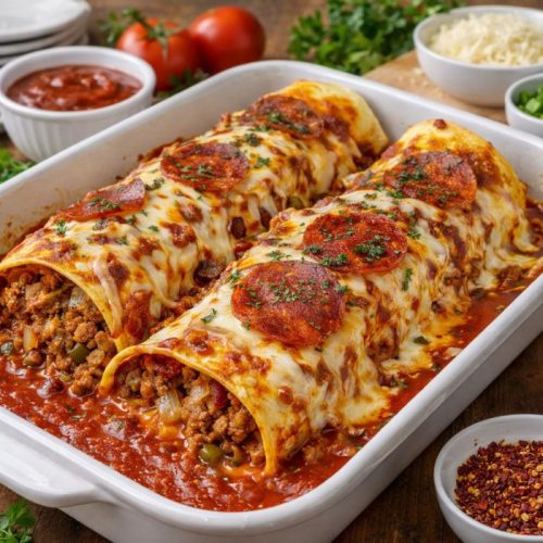 Pizza Enchilada Bake Beef is a layered, rolled tortilla casserole filled with seasoned lean ground beef, pizza sauce, ricotta, mozzarella, pepperoni, and bacon. Baked until bubbly and golden, it combines the flavors of classic pizza with the comforting structure of enchiladas.