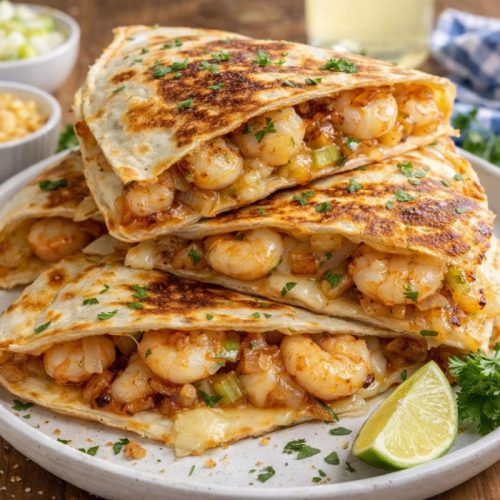 Cheesy Shrimp Quesadilla is filled with juicy seasoned shrimp, sautéed vegetables, and melty Monterey style cheese inside crispy buttered tortillas, finished with bright lime and fresh toppings for a light yet satisfying family meal.