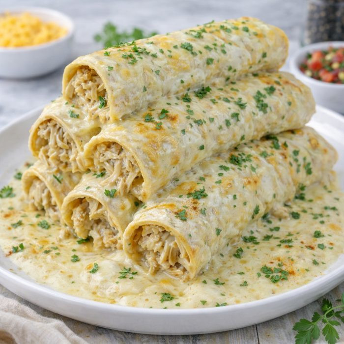 White Chicken Creamy Enchiladas are soft flour tortillas filled with seasoned chicken, covered in a creamy white sauce, and baked until bubbly and golden.