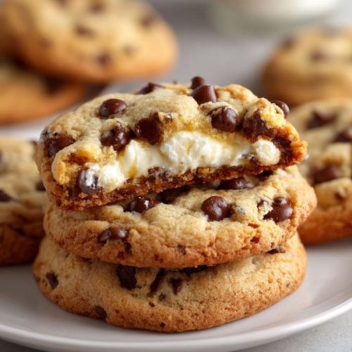 These Chocolate Chip Cheesecake Cookies are soft, chewy cookies with crisp edges and a creamy cheesecake center. They combine classic chocolate chip cookie flavor with a rich, tangy filling that stays gooey and satisfying.