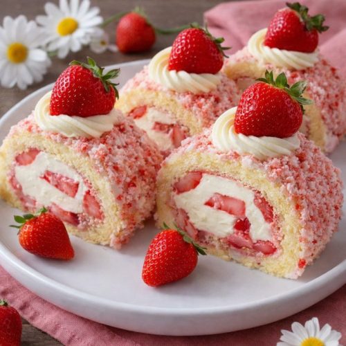 Later that evening, the finished roll chilled quietly in the fridge while the house carried the scent of vanilla and warm sponge cake. The next morning, the first slice revealed beautiful layers of cream and strawberries, and the dessert table suddenly felt a lot more exciting.