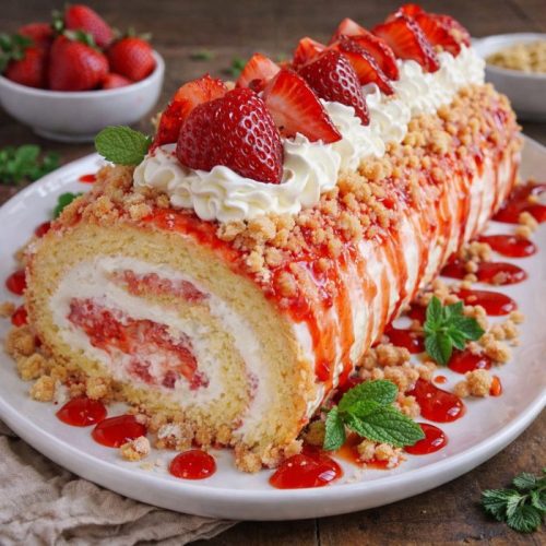 In our house, desserts often turn into small celebrations. A simple slice served after dinner can quickly draw everyone back to the table for a few extra minutes of conversation. This cake roll has become a favorite for birthdays, weekend treats, and neighborhood gatherings. If you enjoy fruity desserts with creamy textures and a little crunch on top, this one is worth trying in your own kitchen.