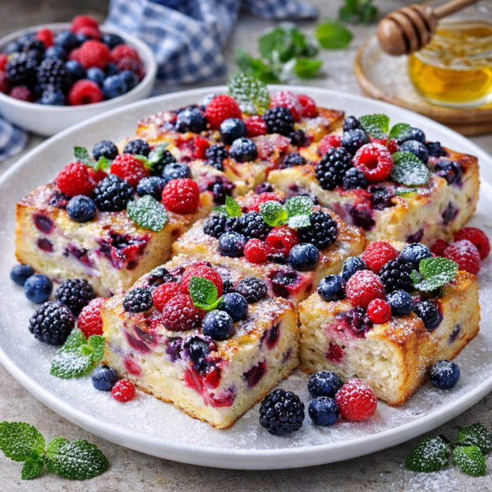 Back home, my daughter was finishing a science project at the kitchen table while my son searched the fridge for something sweet. I spotted cottage cheese, a carton of eggs, and three small containers of berries waiting to be used. The blender hummed, the oven warmed the kitchen, and soon a golden berry bake filled the house with the smell of vanilla and lemon. When we sliced into it later that evening, the texture was soft, creamy, and bright with bursts of fruit. That tray disappeared quickly, and I knew it was exactly the kind of practical recipe worth sharing with other busy families.