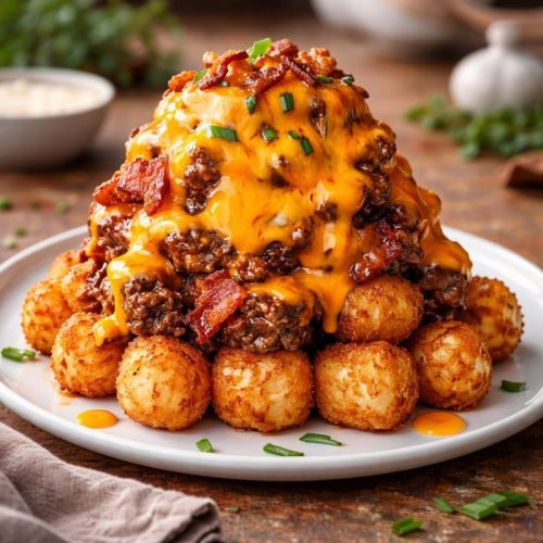 Crispy tater tots shaped into cones and filled with a savory cheeseburger mixture of beef, bacon, and melty cheese, finished with classic burger-style sauce.