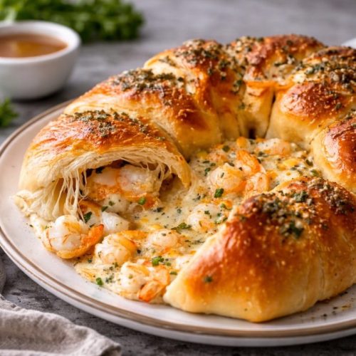 A flaky crescent ring filled with creamy garlic butter seafood, featuring shrimp and crab in a rich, cheesy mixture baked until golden and crisp.
