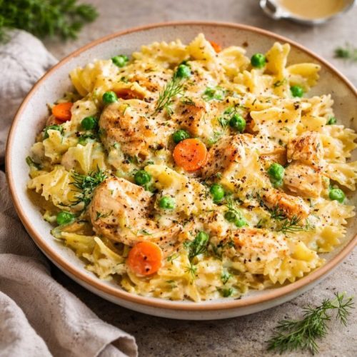 A creamy, comforting pasta dish inspired by classic pot pie flavors, combining tender chicken, vegetables, and a rich, cheesy sauce.
