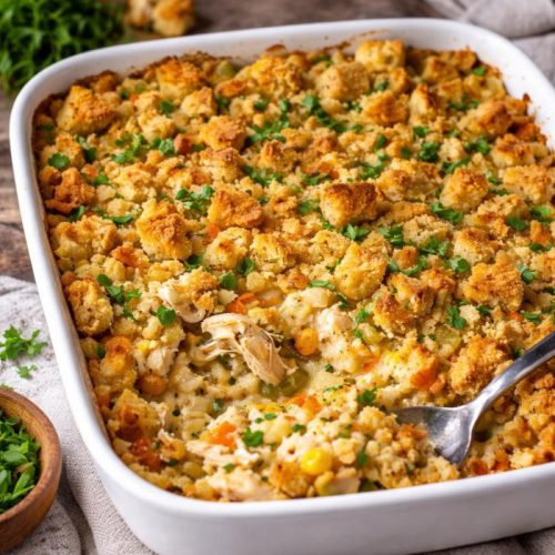 Chicken Stuffing Casserole is a creamy, hearty baked dish made with tender chicken, mixed vegetables, and a savory stuffing topping, perfect for an easy family dinner.