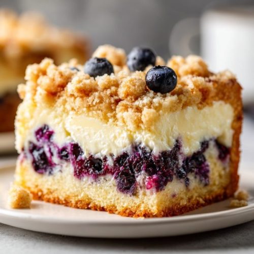 This blueberry cream cheese coffee cake features a soft, tender crumb layered with a smooth cream cheese filling and bursts of juicy blueberries, all topped with a buttery streusel.