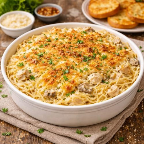 Chicken Alfredo Tetrazzini is a creamy, baked pasta dish made with tender shredded chicken, rich Alfredo sauce, and a blend of comforting ingredients, topped with golden Parmesan for a satisfying family dinner.